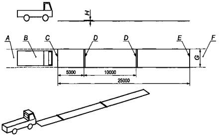 допускается, чтобы центр диска находился немного впереди (до При измерении вибрации, воздействующей на ноги стоящего человека, датчик вибрации размещают на опорной поверхности посередине между сводами его ступней. 8 Условия проведения испытаний8.1 Испытательный участок Испытательный путь представляет собой ровную поверхность длиной Схема испытательного участка с препятствиями показана на рисунке 1. Высота препятствия -