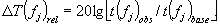 где оба члена в правой части также должны быть выражены в децибелах (относительно опорного значения 10-6 м/с2). Формулу (3) можно преобразовать, выразив T(fj)rel через значения порогов, выраженных в метрах на секунду в квадрате, м/с2: