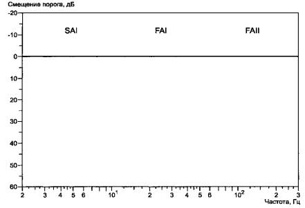 5.5 Тактограмма Тактограмма представляет собой график в осях порога вибротактильной чувствительности (ось ординат) и частоты или эквивалентной частоты (ось абсцисс) с логарифмическими шкалами координат (см. рисунок 1). Диапазон изменений смещения порога от минус 20 до 60 дБ. На графике могут быть указаны области частот, соответствующие возбуждению разных популяций механорецепторов. Примечание 1 - Диапазон частот измерения порогов вибротактильной чувствительности, определенный ИСО 13091-1, охватывает области действия механорецепторов SAI, FAI и FAII, указанных в ИCO 13091-1, таблица 3.