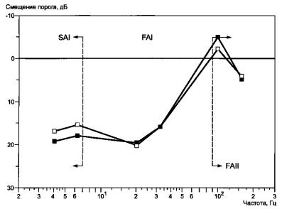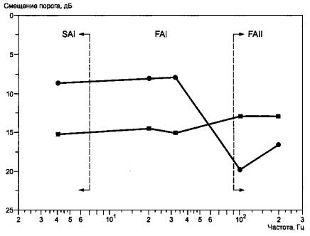 Средний порог вибротактильной чувствительности здоровых субъектов повышается с возрастом примерно на 0,03 дБ в год на частотах, соответствующих SAI, на 0,08 дБ в год на частотах, соответствующих FAI, и на 0,25-0,35 дБ в год на частотах, соответствующих FAII. Для FAII этот эффект зависит также от частоты возбуждения: на частоте 100 Гц он менее выражен, чем на частоте 160 Гц. В соответствии с этим могут быть скорректированы средние значения вибротактильной чувствительности для субъектов, чей возраст не равен 30 годам. Однако необходимо иметь в виду, что закон изменения с возрастом порогов вибротактильной чувствительности для отдельных субъектов может отличаться от вышеприведенного весьма существенно.