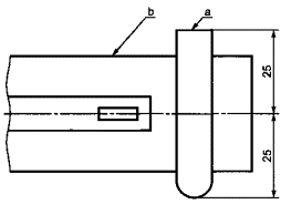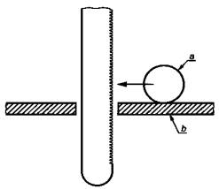 с) Вид сверху направляющей плиты с положением испытательного пальца а - испытательный палец, b - направляющая плита Рисунок 101 - Испытательный щуп б) Для других видов пил с возвратно-поступательным движением пильного полотна Для предотвращения непреднамеренного прикосновения к движущимся частям должно быть предусмотрено защитное устройство. Испытание проводят осмотром. Если пила сконструирована так, что зона захвата (удержания пилы рукой) находится вблизи или