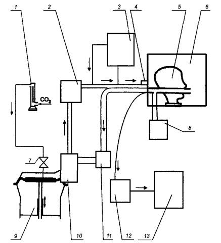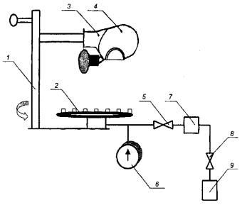 1 - стойка с ложементом для подвода самоспасателя в зону пламени; 2 - горелка с форсунками; 3 - металлический муляж головы человека; 4 - капюшон самоспасателя; 5, 8 - вентили; 6 - прибор для измерения давления газа; 7 - редуктор; 9 - баллон с пропаном Рисунок 1 - Схема огневой установки по определению устойчивости самоспасателя к воздействию открытого пламени 8.9 Проверка сохранения работоспособности самоспасателя после воздействия теплового потока плотностью (8,5 ± 0,5) кВт/м28.9.1 Оборудование и средства измерения: - металлический муляж головы человека; - секундомер с погрешностью не более ± 0,1 с; - насос «искусственные легкие», имитирующий вентиляционную функцию легких человека и создающий легочную вентиляцию 35 дм3/мин (20 циклов в минуту по 1,75 дм3 за 1 цикл); - датчик для измерения плотности теплового потока, диапазон измерений от 2 до 20 кВт/м2 с погрешностью не более ± 5 %; - вольтметр, предел измерений от 0 до 100 мВ, класс точности не ниже 0,5; - мановакуумметр с диапазоном измерений от минус 1000 до 1000 Па с погрешностью не более ±20 Па. 8.9.2 Подготовка к испытаниям Надевают капюшон (лицевую часть) на металлический муляж головы человека. Соединяют муляж с насосом «искусственные легкие» (рисунок 2). Включают источник теплового потока и с помощью датчика теплового потока определяют место, в котором плотность теплового потока составляет (8,5 ± 0,5) кВт/м2, и отмечают данное место на подставке. Устанавливают на подставку разделительный экран. На отмеченное место ставят металлический муляж головы человека с надетым капюшоном (лицевой частью). Включают насос «искусственные легкие». 8.9.3 Проведение испытания Убирают разделительный экран. Испытание проводят в течение 3 мин. В процессе испытания контролируют сопротивление дыханию на вдохе и выдохе в самоспасателе при легочной вентиляции 35 дм3/мин.