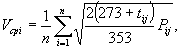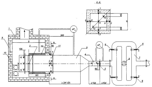 где Vcp j - средняя скорость газового потока, м/с; F - расчетная площадь проходного сечения, м2; F = 0,5(F0 + Fф), здесь F0 - начальная (проектная) площадь проходного сечения, м2; Fф - фактическая площадь проходного сечения, м2; tij - температура в печи в i-й точке в j-й момент времени испытания, °С; Pij - перепад давления на КПД в i-й точке в j-й момент времени испытания, Па; Qj - среднее значение расхода в j-й момент времени испытания, м3/с. п - число измерений в течение времени испытаний. 9.6 Коэффициент расхода дымового люка определяется по соотношению: