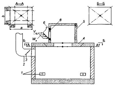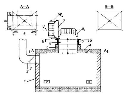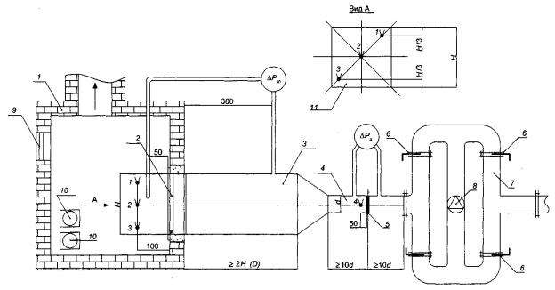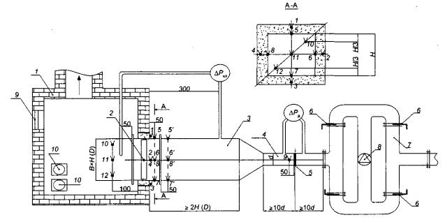 5.4 Перепад давления на испытываемом образце в процессе теплового воздействия должен составлять (70 ± 5) Па для противопожарных нормально открытых клапанов и для клапанов двойного действия, перепад давления для противопожарных нормально закрытых клапанов и для дымовых клапанов должен составлять (300 ± 6) Па. 5.5 Для клапанов двойного действия после завершения теплового воздействия должна быть выполнена проверка работоспособности образца клапана (открытие заслонки) путем подачи сигнала управления на механизм привода. 5.6 Сущность метода испытаний дымовых люков (клапанов) вытяжной противодымной вентиляции с естественным побуждением тяги заключается в оценке работоспособности и пожарно-технических характеристик конструкции образца при одностороннем тепловом воздействии по 5.3 в совокупности с механической и ветровой нагрузками. Работоспособность дымового люка характеризуется безотказностью срабатывания и надежностью конструкции к разрушению при испытаниях. 5.7 Безотказность срабатывания конструкции дымового люка определяется безусловным воспроизведением рабочего цикла управляемого перемещения крышки дымового люка в открытое положение. 5.7.1 Устойчивость к разрушению конструкции дымового люка определяется отсутствием повреждений, при которых: фиксатор привода не обеспечивает сохранения открытого положения крышки дымового люка; проходное сечение корпуса дымового люка уменьшается более чем на 10 % площади от первоначального; возможно внутреннее выпадение фрагментов конструкции дымового люка. 5.8 Пожарно-технические характеристики конструкции дымового люка характеризуются инерционностью срабатывания и (при необходимости) коэффициентом расхода. 5.8.1 Инерционность срабатывания конструкции дымового люка определяется интервалом времени от начала действия привода до момента управляемого перемещения заслонки дымового люка в открытое положение и не должна превышать 90 с. 5.8.2 Коэффициент расхода конструкции дымового люка определяется эффективностью использования площади проходного сечения конструкции дымового люка. 5.8.3 Наружная механическая нагрузка на конструкцию дымового люка (клапана) в процессе теплового воздействия должна быть эквивалентна снеговой нагрузке с установленным значением не менее (600 ± 50) Н/м2 заслонки дымового люка (клапана). 5.8.4 Ветровая нагрузка на конструкцию дымового люка (клапана) в процессе теплового воздействия должна соответствовать нормативному значению ветрового давления, но не менее (11 ± 1) м×с-1. 5.9 С учетом специфики функционального назначения конструкций противопожарных клапанов и дымовых люков (клапанов) указанные значения в 5.2, 5.3, 5.4, 5.8.3 и 5.8.4 температурные режимы, значения величин перепада давления, значения механической и ветровой нагрузки могут быть изменены в соответствии с технической документацией заказчика. 6 Стендовое оборудование и измерительная аппаратура6.1 Стенд для проведения испытаний клапанов состоит (обязательное приложение А, рисунки А.1, А.2, А.3) из печи с внутренними размерами не менее 1,2´1,1´0,7 м, с проемом для установки клапанов, системы для поддержания и регулирования избыточного давления на образце, соединительных магистралей для стыковки испытываемого образца с указанной выше системой. Система поддержания и регулирования избыточного давления состоит из ве