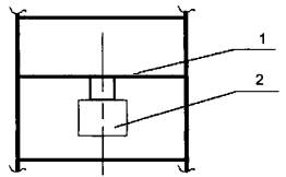 1 - испытываемая ступенька; 2 - груз Рисунок 2 - Испытание ступеньки лестницы на величину остаточной деформации 9.10 Проверка стойкости ступеньки на срез Отбор образцов Испытания проводят на одном образце лестницы. Оборудование: а) секундомер по ГОСТ 5072; б) контрольный груз массой (150 ± 5) кг; в) пластина для проверки величины остаточной деформации в соответствии с рисунком Б.1 (приложение Б). Проведение испытания Лестницу устанавливают в соответствии с РЭ на полную длину. Измеряют горизонтальность испытываемой ступеньки с погрешностью не более ±1°. Производят нагружение ступеньки вплотную к одной из тетив путем подвески контрольного груза (см. рисунок 3) через пластину в соответствии с рисунком Б.1 (приложение Б). Время воздействия нагрузки должно составлять (120 ± 1) с. После снятия нагрузки проводят проверку горизонтальности ступеньки. Оценка результатов Изделие считается выдержавшим испытание, если не произошло отрыва ступеньки лестницы от тетивы, сохраняется горизонтальность нагружаемой ступеньки. После данного испытания лестница подлежит утилизации.