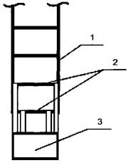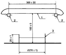 1 - испытываемый образец (тетивы, ступеньки); 2 - опоры; 3 - емкость для горючего Рисунок 5 - Схема испытаний образца ступеньки и тетивы лестницы на воздействие открытого пламени Проведение испытания Испытание проводится в следующей последовательности: - установить образец тетивы на стенд для огневых испытаний в соответствии с рисунком 5; - наполнить емкость, расположенную по центру стенда, спиртом этиловым (ГОСТ 18300 или ГОСТ 17299) в количестве (10 ± 1) мл при температуре (20 ± 5)°С; - поджечь спирт этиловый и в течение (30 ± 1) с выдержать образец под воздействием открытого пламени; - повторить указанные выше действия для ступеньки лестницы. После прекращения воздействия пламени при помощи секундомера фиксируется время остаточного горения и тления материала тетивы и ступеньки; - после воздействия открытым пламенем на тетиву, в течение 0,5 часа произвести нагружение образца лестницы в соответствии с 9.11; - после воздействия открытым пламенем на ступеньку, в течение 0,5 часа произвести нагружение образца в соответствии с 9.9. Оценка результатов Изделие считают выдержавшим испытание, если время остаточного горения и тления материала не превышает 5 с, лестница выдержала нагрузку без разрушения тетив. Остаточная деформация ступеньки не превысила 2 % ширины в свету испытываемой лестницы. После данного испытания лестница подлежит утилизации. 9.16 Проверка назначенного ресурса Отбор образцов Испытания проводят на одном образце лестницы. Проведение испытания Испытание проводят путем выполнения назначенного в конструкторской документации (КД) количества рабочих циклов для одного изделия. Продолжительность испытаний должна составлять не менее 50 циклов. При сохранении работоспособности после 50 циклов применения проводят испытание и оценку изделия по методике, изложенной в 9.11. Оценка результатов Изделие считают выдержавшим проверку назначенного ресурса, если в процессе испытания не произошло ни одного отказа. При испытаниях, связанных со спусками по лестнице людей, в обязательном порядке осуществлять верхнюю страховку испытателей в соответствии с рисунком Г.1 (приложение Г). После данного испытания лестница подлежит утилизации. 9.17 Проверка соответствия упаковки Отбор образцов Испытания проводят на трех образцах лестниц. Проведение испытания Проверка упаковки производится визуально сличением образцов с требованиями конструкторской документации. Оценка результатов Изделие считают выдержавшим проверку, если не обнаружено несоответствие упаковки требованиям конструкторской документации. 9.18 Проверка соответствия маркировки требованиям нормативных документов Отбор образцов Испытания проводят на трех образцах лестниц. Проведение испытания Проверка маркировки производится визуально сличением образцов с требованиями настоящего стандарта. Оценка результатов Изделие считают выдержавшим проверку, если не обнаружено несоответствие маркировки требованиям настоящего стандарта. 9.19 Проверка соответствия комплектности требованиям нормативных документов Отбор образцов Испытания проводят на трех образцах лестниц. Проведение испытания Проверка комплектности производится визуально сличением образцов с требованиями стандарта. Оценка результатов Изделие считают выдержавшим проверку, если не обнаружено несоответствие комплектации тре