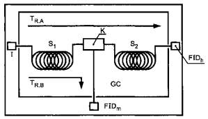 GC - газовый хроматограф с термостатом колонок; I - инжектор (устройство ввода пробы) с разделением потока; S1 - капиллярная разделительная колонка (первая колонка); S2 - капиллярная разделительная колонка (основная колонка); К - делитель потока в соответствии с методом Динса; ТR.A - поток газа-носителя во вторую колонку; Tr.B - поток газа-носителя в контрольный детектор; FIDm - контрольный пламенно-ионизационный детектор; FIDh - основной пламенно-ионизационный детектор