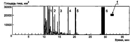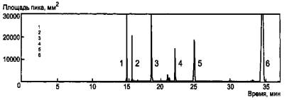 1 - МТВЕ; 2 - метанол; 3 - 2-метилпропан-2-ол; 4 - бензол; 5 - стандарт; 6 - толуол
