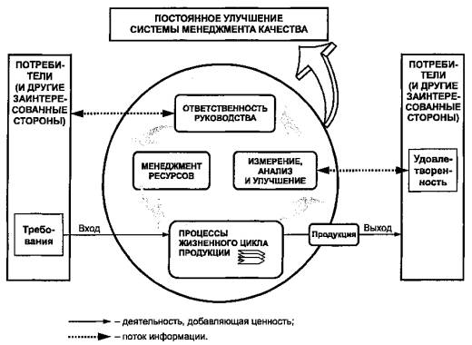 Рисунок 1 - Модель системы менеджмента качества, основанной на процессном подходе Примечание - Формулировки, приведенные в круглых скобках, не применимы к ИСО 9001:2000. 2.5 Политика и цели в области качестваПолитика и цели в области качества устанавливаются, чтобы служить ориентиром для организации. Они определяют желаемые результаты и способствуют использованию организацией необходимых ресурсов для достижения этих результатов. Политика в области качества обеспечивает основу для разработки и анализа целей в области качества. Цели в области качества должны быть согласованы с политикой в области качества и стремлением к постоянному улучшению, а результаты должны быть измеримыми. Достижение целей в области качества может оказывать позитивное воздействие на качество продукции, результативность работы и финансовые показатели и, как следствие, на удовлетворенность и уверенность заинтересованных сторон. 2.6 Роль высшего руководства в системе менеджмента качестваС помощью лидерства и реальных действий высшее руководство может создать обстановку, способствующую полному вовлечению работников и эффективной работе системы менеджмента качества. Принципы менеджмента качества могут использоваться высшим руководством как основа для выполнения своей роли при: a) разработке и поддержании политики и целей организации в области качества; b) популяризации политики и целей в области качества во всей организации для повышения осознания, мотивации и вовлечения персонала; c) ориентации всего персонала организации на требования потребителей; d) внедрении соответствующих процессов, позволяющих выполнять требования потребителей и других заинтересованных сторон и достигать цели в области качества; e) разработке, внедрении и поддержании в рабочем состоянии результативной и эффективной системы менеджмента качества для достижения поставленных целей в области качества; f) обеспечении необходимыми ресурсами; g) проведении периодического анализа системы менеджмента качества; h) принятии решений в отношении политики и целей в области качества; i) принятии решений по мерам улучшения системы менеджмента качества. 2.7 Документация2.7.1 Значение документации Документация дает возможность передать смысл и последовательность действий и способствует: a) достижению соответствия требованиям потребителя и улучшению качества; b) обеспечению соответствующей подготовки кадров; c) повторяемости и прослеживаемости; d) обеспечению объективных свидетельств; e) оцениванию результативности и постоянной пригодности системы менеджмента качества. Разработка документации не должна быть самоцелью, а должна добавлять ценность для ее пользователей. 2.7.2 Виды документов, применяемых в системах менеджмента качества В системах менеджмента качества применяют следующие виды документов: a) документы, предоставляющие согласованную информацию о системе менеджмента качества организации, предназначенную как для внутреннего, так и внешнего пользования (к таким документам относятся руководства по качеству); b) документы, описывающие, как система менеджмента качества применяется к конкретной продукции, проекту или контракту (к таким документам относятся планы качества); c) документы, устанавливающие требования (к таким документам относятся спецификации); d) документы, сод