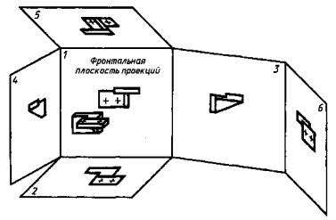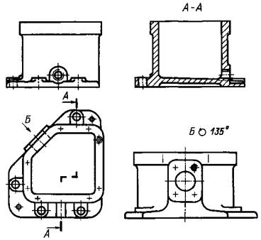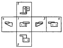 Рисунок 1 4.3 За основные плоскости проекций принимают шесть граней куба; грани совмещают с плоскостью, как показано на рисунке 2. Грань 6 допускается располагать рядом с гранью 4. 4.4 Изображение на фронтальной плоскости проекций принимается на чертеже в качестве главного. Предмет располагают относительно фронтальной плоскости проекций так, чтобы изображение на ней давало наиболее полное представление о форме и размерах предмета. 4.5 В зависимости от содержания изображения разделяют на виды, разрезы, сечения. Масштаб изображений, расположенных в непосредственной проекционной связи друг с другом на основных плоскостях проекций, принимают за масштаб выполнения документа и записывают в соответствующем реквизите основной надписи (ГОСТ 2.104). Все иные изображения, выполненные на чертеже в ином масштабе, должны иметь о нем указания. 4.6 Для уменьшения количества изображений допускается на видах показывать необходимые невидимые части поверхности предмета с помощью штриховых линий (см. рисунок 3). 4.7 При выполнении разреза мысленное рассечение предмета относится только к данному разрезу и не влечет за собой изменения других изображений того же предмета. На разрезе показывают то, что получается в секущей плоскости и что расположено за ней (см. рисунок 4). Допускается изображать не все, что расположено за секущей плоскостью, если это не требуется для понимания конструкции предмета (см. рисунок 5). 4.8 На сечении показывают только то, что получается непосредственно в секущей плоскости (см. рисунок 6). Допускается в качестве секущей применять цилиндрическую поверхность, развертываемую затем в плоскость (см. рисунок 7). 4.9 Количество изображений (видов, разрезов, сечений) должно быть наименьшим, но обеспечивающим полное представление о предмете при применении установленных в соответствующих стандартах условных обозначений, знаков и надписей. 5 Виды5.1 Установлены следующие названия видов, получаемых на основных плоскостях проекций (основные виды, рисунок 2): 1 - вид спереди (главный вид); 2 - вид сверху; 3 - вид слева; 4 - вид справа; 5 - вид снизу; 6 - вид сзади. При выполнении графических документов в форме электронных моделей (ГОСТ 2.052) для получения соответствующих изображений следует применять сохраненные виды. В строительных чертежах в необходимых случаях соответствующим видам допускается присваивать специальные названия, например «фасад». Названия видов на чертежах надписывать не следует, за исключением случая, предусмотренного в 5.2. В строительных чертежах допускается надписывать название вида с присвоением ему буквенного, цифрового или другого обозначения. 5.2 Если виды сверху, слева, справа, снизу, сзади не находятся в непосредственной проекционной связи с главным изображением (видом или разрезом, изображенным на фронтальной плоскости проекции), то направление проецирования должно быть указано стрелкой около соответствующего изображения. Над стрелкой и над полученным изображением (видом) следует нанести одну и ту же прописную букву (см. рисунок 8). Рисунок 8 Чертежи оформляют так же, если перечисленные виды отделены от главного изображения другими изображениями или расположены не на одном листе с ним. Когда отсутствует изображение, на котором может быть показано направление взгляда, название вида надписывают. В строительных чертежах доп