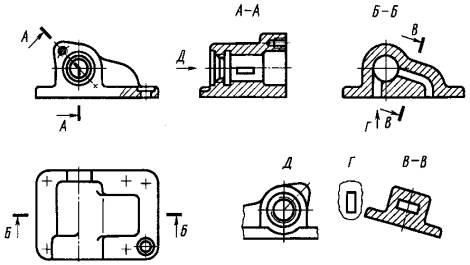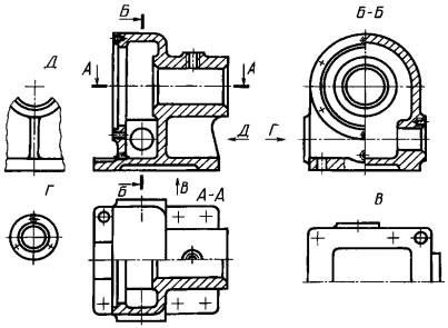 Рисунок 14 6 Разрезы6.1 В зависимости от положения секущей плоскости относительно горизонтальной плоскости проекций разрезы разделяют на: - горизонтальные (например, разрез А-А, рисунок 13; разрез Б-Б, рисунок 15). В строительных чертежах горизонтальным разрезам допускается присваивать другие названия, например «план»; - вертикальные (например, разрез на месте главного вида, рисунок 13; разрезы А-А, В-В, Г-Г, рисунок 15); - наклонные (например, разрез В-В, рисунок 8). В зависимости от числа секущих плоскостей разрезы разделяют на: - сложные (например, разрез А-А, рисунок 8; разрез Б-Б, рисунок 15). Рисунок 15 6.2 Вертикальный разрез бывает фронтальным (например, разрез, рисунок 5, разрез А-А, рисунок 16), и профильным (например, разрез Б-Б, рисунок 13). 6.3 Сложные разрезы бывают ступенчатыми (например, ступенчатый горизонтальный разрез Б-Б, рисунок 15; ступенчатый фронтальный разрез А-А, рисунок 16) и ломаными (например, разрезы А-А, рисунки 8 и 15).