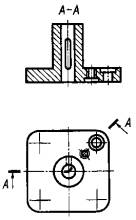секущих плоскостей между собой. На начальном и конечном штрихах следует ставить стрелки, указывающие направление взгляда (см. рисунки 8-10, 13, 15); стрелки следует наносить на расстоянии 2- Начальный и конечный штрихи не должны пересекать контур соответствующего изображения. В случаях, подобных указанному на рисунке 18, стрелки, указывающие направление взгляда, наносят на одной линии. 6.6 У начала и конца линии сечения, а при необходимости, и у мест пересечения секущих плоскостей ставят одну и ту же прописную букву русского алфавита. Буквы наносят около стрелок, указывающих направление взгляда, и в местах пересечения со стороны внешнего угла. Разрез должен быть отмечен надписью по типу «А-А» (всегда двумя буквами через тире). В строительных чертежах у линии сечения взамен букв допускается применять цифры, а также надписывать название разреза (плана) с присвоенным ему буквенным цифровым или другим обозначением. 6.7 Когда секущая плоскость совпадает с плоскостью симметрии предмета в целом, а соответствующие изображения расположены на одном и том же листе в непосредственной проекционной связи и не разделены какими-либо другими изображениями, для горизонтальных, фронтальных и профильных разрезов не отмечают положение секущей плоскости и разрез надписью не сопровождают (например, разрез на месте главного вида, рисунок 13). 6.8 Фронтальным и профильным разрезам, как правило, придают положение, соответствующее принятому для данного предмета на главном изображении чертежа (см. рисунок 12). 6.9 Горизонтальные, фронтальные и профильные разрезы могут быть расположены на месте соответствующих основных видов (см. рисунок 13). 6.10 Вертикальный разрез, когда секущая плоскость не параллельна фронтальной или профильной плоскостям проекций, а также наклонный разрез должны строиться и располагаться в соответствии с направлением, указанным стрелками на линии сечения. Допускается располагать такие разрезы в любом месте чертежа (разрез В-В, рисунок 8), а также с поворотом до положения, соответствующего принятому для данного предмета на главном изображении. В последнем случае к надписи должно быть добавлено условное графическое обозначение 6.11 При ломаных разрезах секущие плоскости условно повертывают до совмещения в одну плоскость, при этом направление поворота может не совпадать с направлением взгляда (см. рисунок 19). Если совмещенные плоскости окажутся параллельными одной из основных плоскостей проекций, то ломаный разрез допускается помещать на месте соответствующего вида (разрезы А-А, рисунки 8, 15). При повороте секущей плоскости элементы предмета, расположенные за ней, вычерчивают так, как они проецируются на соответствующую плоскость, с которой производится совмещение (см. рисунок 20).