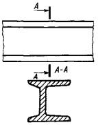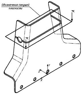 Рисунок 30 В электронных моделях применяют только наложенные сечения (см. рисунок 31). Рисунок 31 7.2 На чертежах контур вынесенного сечения, а также сечения, входящего в состав разреза, изображают сплошными основными линиями, а контур наложенного сечения - сплошными тонкими линиями, причем контур изображения в месте расположения наложенного сечения не прерывают (см. рисунки 13, 28, 29). 7.3 Ось симметрии вынесенного или наложенного сечения (см. рисунки 6, 29) указывают штрих-пунктирной тонкой линией без обозначения буквами и стрелками и линию сечения не проводят. В случаях, подобных указанному на рисунке 30, при симметричной фигуре сечения линию сечения не проводят. 7.4 Во всех остальных случаях на чертежах для линии сечения применяют разомкнутую линию с указанием стрелками направления взгляда и обозначают ее одинаковыми прописными буквами русского алфавита (в строительных чертежах - прописными или строчными буквами русского алфавита или цифрами). На чертежах сечение сопровождают надписью по типу «А-А» (см. рисунок 28). В строительных чертежах допускается надписывать название сечения. На электронных моделях сечение надписью не сопровождают. Рекомендуется присваивать сохраненному виду, который служит для отображения сечения, одноименное с сечением наименование по типу «А-А». 7.5 На электронных моделях для указания расположения и направления взгляда на сечение следует использовать визуальное представление секущей плоскости. Контур изображения секущей плоскости изображают сплошными основными линиями, а контур наложенного сечения - сплошными тонкими линиями, причем контур изображения в месте расположения наложенного сечения не прерывают (см. рисунки 31, 32). Допускается выделять изображение секущей плоскости цветом, отличным от цвета изображения предмета, если устройство отображения электронно-вычислительной машины это позволяет. Рисунок 32 На чертежах для несимметричных сечений, расположенных в разрыве (см. рисунок 33) или наложенных (см. рисунок 34), линию сечения проводят со стрелками, но буквами не обозначают.