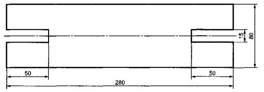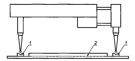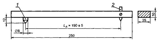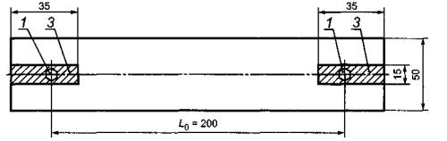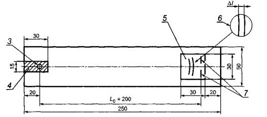 Толщина пластины 6 мм с) Стальная пластина 1 - измерительные метки; 2 - основа; 3 - участки с удаленным покровным слоем Рисунок 2 - Образец и средства испытаний (метод В) 5.2 Средства испытаний для методов А и В5.2.1 Сушильный шкаф с циркуляцией воздуха (без подачи воздуха извне), обеспечивающий поддержание температуры (80 ± 2) °С. 5.2.2 Термодатчик, связанный с наружным электронным термометром, обеспечивающий измерение температуры с погрешностью не более ± 1 °С в заданном температурном режиме. 5.2.3 Стальная пластина размерами » 280×80×6 мм с прорезями; используется как шаблон для частичного удаления покровного слоя и выравнивания образца при нанесении рисок и во время проведения измерений (см. рисунки 1 и 2). 5.2.4 Стеклянная пластина, покрытая тальком. 5.3 Средства испытаний для метода А (оптический метод)5.3.1 Общие требования Кроме средств испытаний, приведенных в 5.2, используют дополнительное оборудование, приведенное в 5.3.2-5.3.7. 5.3.2 Устройство из стали для нанесения рисок размерами » 25×10×250 мм с центрирующим конусом (диаметр » 8 мм, высота » 12 мм, угол конуса » 60°) и съемной иглой (диаметр заостренного конца иглы » 0,05 мм); расстояние от оси конуса до заостренного конца иглы LA = (190 ± 5) мм (см. рисунок 1). 5.3.3 Гайки М5 или аналогичные приспособления, используемые в качестве измерительных меток. 5.3.4 Алюминиевые бирки размерами » 30×30×0,2 мм, на которые наносятся риски. 5.3.5 Канцелярский степлер для прикрепления алюминиевых бирок. 5.3.6 Измерительный инструмент со шкалой не менее 250 мм и ценой деления не более 1 мм. 5.3.7 Оптическое устройство для измерения длины (например измерительная лупа) с ценой деления не более 0,05 мм. 5.4 Средства испытаний для метода В (механический метод)5.4.1 Общие требования Кроме средств испытаний, приведенных в 5.2, используют дополнительное оборудование, приведенное в 5.4.2 и 5.4.3. 5.4.2 Экстензометр с измерительной базой 200 мм, снабженный механическим или электронным измерительным устройством с погрешностью измерения не более ± 0,05 мм. 5.4.3 Измерительные метки для экстензометра. 6 Отбор образцовОтбор образцов проводят в соответствии с требованиями стандартов на материалы конкретных видов. Из полосы материала, отобранной для испытаний, вырубают пять образцов размерами [(250×50) ± 1] мм равномерно по ширине полотна материала на расстоянии не менее 150 мм от края полотна, при этом больший размер образца должен быть расположен в продольном направлении полотна материала. Для материалов, содержащих более одной основы, вырубают 10 образцов. Образцы нумеруют последовательно, начиная от одного края полотна материала; маркируют также лицевую и нижнюю стороны образца. 7 Подготовка образцовУдаляют защитную пленку с образца путем прикрепления к нему полоски клеящей ленты при температуре окружающей среды, охлаждения образца до температуры определения его гибкости, приведенной в нормативном или техническом документе на материал конкретного вида, и последующего удаления защитной пленки с помощью прикрепленной полоски. Пленку можно удалить также струей сжатого воздуха при давлении не более 5 бар (5 · 105 Па), диаметр сопла » 0,5 мм. Если с помощью указанных выше способов пленку удалить не удается, можно использовать обжиг пленки пламенем газовой горелки в течение минимального времени, необходимого для удаления пленки, не повреждая при этом покровный слой образца. С нижней
