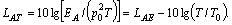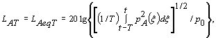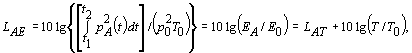 где Если звуковое давление выражают в паскалях, а текущее время - в секундах, то размерность корректированного по А звукового воздействия - паскаль в квадрате в секунду. 3 Звуковое воздействие в паскалях в квадрате в час удобнее для таких применений, как измерения звукового воздействия шума на рабочих местах (см. [5]). 4 В национальных стандартах Российской Федерации применяют также эквивалентный термин «доза шума». 3.11 уровень звукового воздействия (sound exposure level), дБ: Десять десятичных логарифмов отношения звукового воздействия к опорному звуковому воздействию; опорное звуковое воздействие - произведение квадрата опорного звукового давления и опорного интервала времени 1 с. Примечания 1 Корректированный по А уровень звукового воздействия LAE связан с соответствующим средним по времени корректированным по А уровнем звука LAT или LAeqT соотношением: где EA - корректированное по A звуковое воздействие, Па2·с [см. формулу (3)]; Е0 - опорное звуковое воздействие, равное (20 мкПа)2·(1 с) = 400·10-12·Па2·с; Т0 = 1 с; Т = t2 - t1, интервал времени измерений в секундах для уровня звукового воздействия и среднего по времени уровня звука. 2 Средний по времени корректированный по А уровень звука LAT или LAeqT в течение интервала времени T связан с общим корректированным по A звуковым воздействием ЕА за этот интервал соотношением: