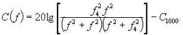 5.4.3 Для конфигурации шумомера, которая указана в руководстве по эксплуатации для нормального режима работы, частотные характеристики и предельные отклонения таблицы 2 применяются для отклика на плоские бегущие звуковые волны, падающие на микрофон с опорного направления. 5.4.4 На любой частоте из таблицы 2 отклонение отображаемого уровня звука от уровня звукового давления в точке расположения микрофона в отсутствие шумомера, увеличенное на расширенную неопределенность измерений, не должно превышать соответствующих предельных отклонений. При этом к уровням звукового давления, измеренным в отсутствие шумомера, необходимо прибавить поправки для соответствующей частотной характеристики по формулам (6), (7) или (8). 5.4.5 Значения частотных характеристик С или А для всех частот, расположенных между двумя последовательными частотами из таблицы 2, должны рассчитываться по формулам (6) или (7) и округляться до десятых децибела. Соответствующие предельные отклонения в этом случае равны наибольшим из отклонений, приведенных в таблице 2 для двух соседних частот. 5.4.6 Частотная характеристика С реализуется двумя низкочастотными полюсами на частоте f1, двумя высокочастотными полюсами на частоте f4 и двумя нулями при 0 Гц. При таких полюсах и нулях зависимость квадрата модуля частотной характеристики С от частоты будет спадать в D2 = 1/2 раз (приблизительно минус 3 дБ) на частотах fL = 101,5 Гц и fH = 103,9 Гц относительно значения на опорной частоте fr = 1 кГц. Частотная характеристика А реализуется добавлением к частотной характеристике С двух связанных фильтров низких частот первого порядка. Для каждого низкочастотного фильтра частота среза равна fA = 102,45 Гц. 5.4.7 Практическая реализация приведенных в таблице 2 частотных характеристик С, А и Z как функций частоты может быть получена из формул (6), (7) и (8) соответственно. 5.4.8 Для любой частоты f в герцах частотную характеристику С, C(f) в децибелах вычисляют по формуле Частотную характеристику A, A(f) в децибелах вычисляют по формуле где С1000 и А1000 - нормирующие постоянные в децибелах, представляющие собой некоторые коэффициенты электрического усиления сигналов, необходимые для обеспечения равенства частотных характеристик нулю децибел на частоте 1 кГц. Частотную характеристику Z, Z(f) в децибелах вычисляют по формуле