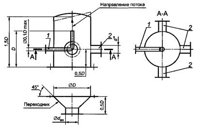 ______________ * Соответствует присоединительному размеру вакуумметра. 1 - напускная трубка; 2 - патрубок для подсоединения вакуумметра Рисунок 1 - Измерительная камера Осевой размер измерительной камеры равен 1,5 D (D - внутренний диаметр камеры). Поток напускаемого в измерительную камеру газа должен быть направлен по оси камеры в сторону, противоположную входному фланцу камеры, на расстоянии от него, равном диаметру камеры. Патрубок для подсоединения вакуумметра должен быть расположен на расстоянии 0,5 D от входного фланца камеры с осью, перпендикулярной к оси камеры. Рекомендуется использовать три патрубка для подсоединения вакуумметров. Ось измерительной камеры должна быть перпендикулярна к плоскости входного фланца насоса. Соединение измерительной камеры с входным отверстием насоса осуществляют с помощью переходника, длина которого не должна превышать 0,5 D в соответствии с рисунком 1. 4.1.2 Объем измерительной камеры VK должен составлять не менее пяти объемов воздуха, захватываемого насосом за один цикл сжатия. Объем воздуха, захватываемого насосом за один цикл сжатия VBC, л, вычисляют по формуле