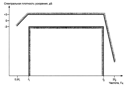 Настоящий стандарт предполагает, что спектральная плотность ускорения имеет прямоугольную форму (плоскую вершину) и все частотные составляющие расположены в диапазоне между частотами f1 и f2 (см. рисунок 1). Однако на практике возбуждаемый сигнал имеет спады спектральной плотности ускорения в областях низких и высоких частот. Чтобы среднеквадратичное значение оставалось как можно более близким к заданному, эти спады должны быть достаточно крутыми. Обычно крутизна спада в области низких частот равна 6 дБ/октава. Если значение спектральной плотности ускорения в точке f1 велико, а возможности испытательной установки по допустимым значениям перемещения ограничены, это может потребовать увеличения крутизны спада в области низких частот. Расчеты перемещения для случайного сигнала приведены в В.2.4.
