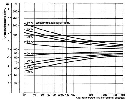 где Ве - разрешение по частоте, Гц; Та - эффективное время усреднения, с. Значение Nd не должно быть менее 120, если только иное требование не установлено соответствующим нормативным документом. Если нормативным документом установлены доверительные уровни, которые необходимо соблюсти при проведении испытаний, для расчета статистической точности следует использовать данные рисунка 3. Рисунок 3 - Статистическая точность воспроизведения спектральной плотности ускорения в зависимости от числа степеней свободы для разных значений доверительной вероятности Разрешение по частоте Bе, Гц, зависит от максимальной тактовой частоты контроллера системы управления и числа линий в спектре сигнала п: