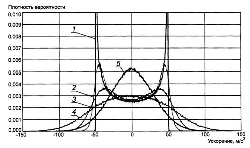 Плотность вероятности распределения для совокупности случайных сигналов и сочетания узкополосного и широкополосного случайных сигналов показана на рисунке 2. Плотность вероятности распределения для сочетания гармонического и случайного сигналов показана на рисунке 4.