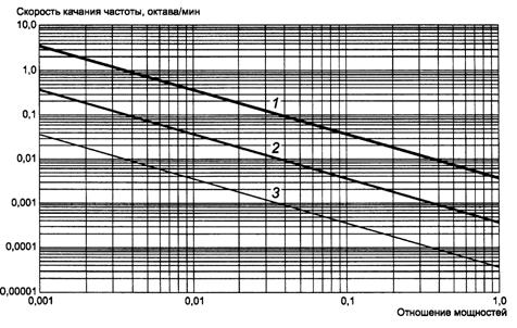 где К - коэффициент, равный двум (если полная погрешность определена через удвоенное стандартное отклонение); Ei - стандартное отклонение инструментальной погрешности; Ес - стандартное отклонение погрешности системы управления. 1 - Esor = 10%; 2 - Esor = 5%; 3 - Esor = 2,5% Рисунок 5 - Рекомендуемая скорость качания частоты в зависимости от отношения мощностей для разных значений Esor 5.2.2 Допуски на значение частоты Применяют следующие допуски на значение частоты гармонического сигнала: 1) для сигнала с качанием частоты: ±1 Гц в диапазоне от 5 до 50 Гц, ±2% в диапазоне выше 50 Гц; 2) для сигнала на фиксированной частоте: ±2%. 5.3 Стратегия управления 5.3.1 Одноточечное или многоточечное управление Если предписано нормативным документом или выявлена в ходе предварительного обследования необходимость проведения испытаний с многоточечным управлением, то должна быть определена стратегия этого управления. Нормативным документом должно быть установлено, какое управление следует применять: одноточечное или многоточечное. Если многоточечное, то нормативным документом должно быть предписано, по какому сигналу осуществляют управление: сигналу, усредненному по проверочным точкам, или по сигналу в некоторой выбранной точке (например, той, где вибрация максимальна). Примечание - Если управление по одной точке невозможно, то используют многоточечное управление, определив способ получения сигнала управления - по среднему или по экстремальному значению в проверочных точках. В любом случае контрольная точка будет воображаемой. Используемый метод управления должен быть отражен в протоколе испытаний. Ниже описаны возможные стратегии управления. 5.3.1.1 Управление по среднему значению В данном способе управления сигнал управления определяют по сигналам в каждой проверочной точке, формируя его посредством арифметического усреднения на каждой частотной составляющей. После чего сравнивают амплитуды всех частотных составляющих сигнала управления и задающего сигнала. 5.3.1.2 Управление по среднему значению с коррекцией Значение амплитуды ас каждой частотной составляющей сигнала управления получают усреднением по амплитудам а1,., ап соответствующих частотных составляющих сигналов в проверочных точках с использованием весовых коэффициентов w1, ... wn: