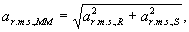Для сигнала, представляющего собой смесь (подстрочный индекс ММ) случайной (подстрочный индекс R) и гармонической (подстрочный индекс S) составляющих, среднеквадратичное значение (подстрочный индекс r.m.s.) ускорения определяют по формуле