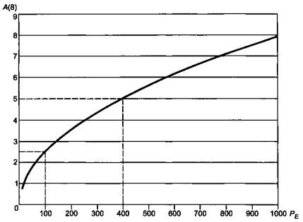 Примечание - Определение полной вибрации дано в ГОСТ 31192.1. Длительность вибрационного воздействия T для данной машины представляет собой сумму m длительностей выполнения каждой рабочей операции в процессе рассматриваемого рабочего цикла (см. пример в 7.2.2 и таблицу D.1). Если в данном цикле выполняется только одна рабочая операция, то ahv,eq = ahv . 3.5 частный индекс вибрационной экспозиции РЕ (partial vibration exposure points): Условная сумма в баллах, характеризующая степень тяжести вибрационного воздействия ahv,eq, м/с2, в течение некоторого промежутка времени T, ч, при использовании одной машины или при выполнении рабочего задания: Примечание - Индекс вибрационной экспозиции представляет собой дополнительный [наряду с вибрационной экспозицией за смену A(8), м/с2] показатель вибрационного воздействия. Указанные величины связаны соотношением: График зависимости (3) приведен на рисунке 1. РЕ - индекс вибрационной экспозиции; А(8) - вибрационная экспозиция за смену Рисунок 1 - Соотношение между индексом вибрационной экспозиции РЕ и вибрационной экспозицией за смену А(8) 3.6 полный индекс вибрационной экспозиции PEtot (total vibration exposure points): Сумма частных индексов вибрационной экспозиции в течение одного рабочего дня: