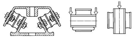 Рисунок 8 - Пример расположения центра масс тела, включающего в себя нагружающую массу и выходной фланец испытуемого объекта 5.2.5 Система возбуждения вибрации Система возбуждения вибрации должна обеспечивать динамическое воздействие на испытуемый объект в заданном направлении в заданном диапазоне частот. Примеры вибровозбудителей, позволяющих реализовать данное требование, приведены в 5.1.5. Примечание - В схемах с одним испытуемым виброизолятором (рисунки 5, 7) трудно обеспечить точное выполнение требования возбуждать колебания строго в направлении поперечной составляющей. Поэтому рекомендуется использовать схемы с двумя номинально эквивалентными испытуемыми виброизоляторами (рисунок 6) или применять несколько вибровозбудителей для подавления нежелательных составляющих вибрации. 5.2.6 Масса распределения возбуждения на входной поверхности Масса распределения возбуждения на входной поверхности испытуемого объекта предназначена для выполнения следующих функций: a) обеспечения равномерного распределения вибрационного возбуждения по поверхности фланца; b) облегчения создания однонаправленного возбуждения (см. примечание). Массу распределения возбуждения не применяют, если испытуемый объект включает в себя жесткий входной фланец, обеспечивающий выполнение вышеуказанных функций. Примечание - Важным условием при измерении динамической жесткости в соответствии с настоящим стандартом (см. 6.4) является возбуждение преимущественно однонаправленного поступательного движения входной поверхности испытуемого объекта. При возбуждении поперечной составляющей выполнению данного условия могут способствовать: a) симметричность направления возбуждения и граничных условий масс распределения возбуждения (см. рисунок 6); b) инерционные свойства массы распределения возбуждения. В некоторых случаях для предотвращения движения в нежелательном направлении необходимо применять дополнительные связи (направляющие движения). 5.3 Подавление нежелательной вибрации 5.3.1 Общие положения Метод измерения переходной динамической жесткости, установленный в настоящем стандарте, предполагает приложение однонаправленного возбуждения поочередно в направлениях нормальной и поперечной составляющих. Однако несимметричность возбуждения, граничных условий или свойств испытуемого объекта может вызвать появление нежелательных составляющих вибрации, искажающих результаты измерений на определенных частотах. Одним из способов уменьшения этого эффекта является использование испытательной установки специального типа с симметричной конфигурацией, предусматривающей установку двух идентичных объектов испытаний, имеющих одинаковую номинальную жесткость. Количественные требования к ограничению нежелательной вибрации приведены в 6.4. 5.3.2 Нормальная составляющая поступательного движения При возбуждении вибрации в направлении нормальной составляющей контроль направления возбуждения важен только для опор сложной формы, когда имеет место взаимосвязь колебаний в разных направлениях (см. примечание к 5.1.6). В этом случае для подавления нежелательной составляющей входного возбуждения используют следующие способы: - симметричное расположение вибровозбудителя или пар вибровозбудителей относительно испытуемого объекта; - массу распреде