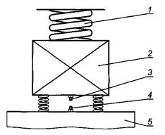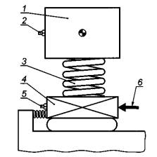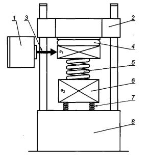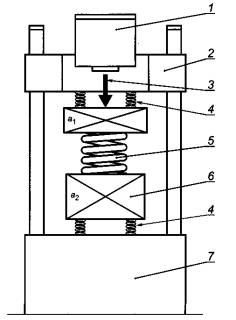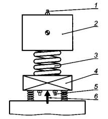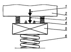 1 - акселерометр (измерение а2); 2 - нагружающая масса; 3 - испытуемый объект; 4 - масса распределения возбуждения; 5 - акселерометр (измерение а1); 6 - динамическое возбуждение Примечание - Сила тяжести, создаваемая нагружающей массой, используется как статическая нагрузка для испытуемого объекта. Рисунок 4 - Лабораторная испытательная установка для измерений переходной динамической жесткости для нормальной составляющей поступательного движения (пример 3) Примечание - Схемы, приведенные на рисунках 2 - 4, не охватывают всех возможных конструктивных исполнений испытательных установок, поэтому они не должны использоваться как основание для ограничений на иные конструктивные решения. Для реализации метода, установленного в настоящем стандарте, испытательная установка должна включать в себя блоки, описанные в 5.1.2 - 5.1.6. Нагружающую массу присоединяют к выходной поверхности испытуемого объекта. Одно из ее назначений заключается в том, чтобы гасить колебания выходной поверхности. Затормаживающую силу определяют по результатам измерений ускорения этой массы. Другое назначение нагружающей массы - обеспечить идентичность колебаний разных точек выходной фланцевой поверхности испытуемого объекта. 5.1.3 Устройство предварительного статического нагружения После установки испытуемый объект должен испытывать воздействие представительной и заданной статических нагрузок, которые можно создать, например, одним из следующих способов: a) использованием в качестве вибровозбудителя гидравлического вибростенда, который способен самостоятельно создавать статическую нагрузку. Испытуемый объект устанавливают внутри рамы вибростенда. Выходную поверхность испытуемого объекта соединяют с нагружающей массой, которая поддерживается вспомогательными виброизоляторами для развязки с рамной конструкцией вибростенда. Суммарная динамическая жесткость вспомогательных виброизоляторов в области низких частот должна быть примерно равна динамической жесткости испытуемого объекта; b) использованием рамной конструкции только для создания статической нагрузки (см. рисунки 2 и 3). В этом случае необходимо установить дополнительные виброизоляторы со стороны входной поверхности испытуемого объекта для его развязки с рамной конструкцией; c) использованием для создания статической нагрузки силы тяжести нагружающей массы, которую помещают на верхнем фланце испытуемого объекта [опорную раму в этом случае не используют (см. рисунок 4)]. 5.1.4 Устройства измерения ускорения Акселерометры устанавливают на входной стороне испытуемого объекта, на нагружающей массе, а также на основании, поддерживающем нагружающую массу. Если невозможно установить акселерометры в центре поверхностей, а также для повышения точности измерений рекомендуется устанавливать по два или (предпочтительно) четыре акселерометра, сигналы с которых усредняют, симметрично центрам этих поверхностей. Вместо акселерометров допускается использовать датчики перемещения или скорости при условии выполнения требований к диапазону частот измерений [см. рисунки 2b) и 4]. 5.1.5 Система возбуждения вибрации Система возбуждения вибрации должна обеспечивать динамическое воздействие на испытуемый объект в заданном диапазоне частот. Это может быть достигнуто с помощью вибровозбудителей разных тип