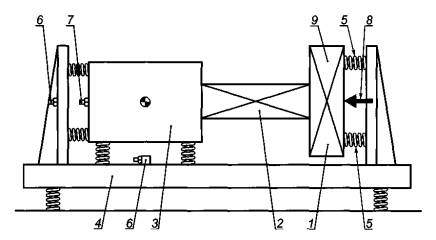 1 - масса распределения возбуждения; 2 - испытуемый объект; 3 - нагружающая масса; 4 - жесткое основание; 5 - вспомогательные виброизоляторы; 6 - акселерометр (измерение а3); 7 - акселерометр (измерение а2); 8 - динамическое возбуждение; 9 - акселерометр (измерение а1) Рисунок 3 - Лабораторная испытательная установка для измерений переходной динамической жесткости для нормальной составляющей поступательного движения (пример 2)