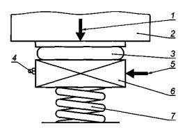 1 - вибровозбудитель; 2 - поперечина; 3 - толкатель; 4 - вспомогательные виброизоляторы; 5 - испытуемый объект; 6 - нагружающая масса; 7 - жесткое основание а) Общий вид