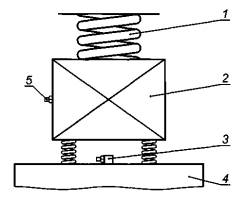 где kav - величина, определенная в 3.7; k0 - опорное значение жесткости, равное 1 Н·м-1. 3.19 вибрация, передаваемая побочным путем (flanking transmission): Силы и ускорения на выходной поверхности, вызванные вибрационным возбуждением входной поверхности виброизолятора, но переданные не через испытуемый объект, а побочным путем. 4 Теоретические основы методаПринципы косвенного метода измерений описаны в ГОСТ ИСО 10846-1. Основное отличие данного метода от прямого метода измерений заключается в том, что затормаживающую выходную силу определяют по измерениям ускорения нагружающей массы т2, которая препятствует колебаниям выходной поверхности испытуемого объекта. Эта масса должна быть динамически развязана с другими узлами испытательной установки, чтобы исключить передачу вибрации побочными путями. При гармонических колебаниях связь переходной динамической жесткости (см. 3.5) с передаточной функцией (см. 3.14) определяется формулой где индексы 1 и 2 обозначают входную и выходную поверхности виброизолятора, соответственно. Получение затормаживающей силы в соответствии с правой частью формулы (1) требует, чтобы эта сила определялась только соответствующей вибрацией нагружающей массы. Поэтому измерению подлежит вибрация центра тяжести нагружающей массы в направлении действия затормаживающей силы. 5 Требования к измерительному и испытательному оборудованию5.1 Нормальная составляющая поступательного движения На рисунках 2 - 4 приведены схемы возможных конструктивных решений установок для испытаний упругих опор при поступательных колебаниях в направлении, соответствующем обычному приложению нагрузки. Испытуемые объекты закрепляют на установке способом, соответствующим условию их эксплуатации.