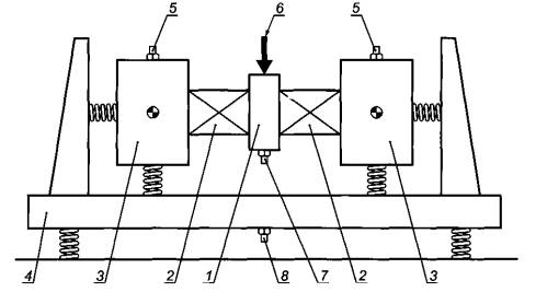 1 - масса распределения возбуждения; 2 - испытуемый объект; 3 - нагружающая масса; 4 - жесткое основание; 5 - акселерометр (измерение а2); 6 - динамическое возбуждение; 7 - акселерометр (измерение а1); 8 - акселерометр (измерение а3) Рисунок 6 - Лабораторная испытательная установка для измерений переходной динамической жесткости для поперечной составляющей поступательного движения (пример 2)