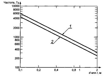 где т2,eff - эффективная масса нагружающей массы. Эффективная масса - частотно-зависимое отношение вынуждающей силы, действующей со стороны упругого элемента на нагружающую массу, к ускорению а2 нагружающей массы. Значение данной динамической характеристики упругого элемента зависит от направления и области возбуждения, а также от места установки акселерометров. Результаты измерений, проведенных в соответствии с требованиями настоящего стандарта, должны быть представлены в диапазоне частот f ≤ f3, а верхнюю границу диапазона частот выбирают согласно 6.2.2 и 6.2.3. 6.2.2 Применение нагружающей массы с заданными свойствами Номограммы, применяемые для определения верхней границы диапазона частот испытаний с использованием в качестве нагружающей массы стальных блоков кубической или цилиндрической формы, изображены на рисунке 9.