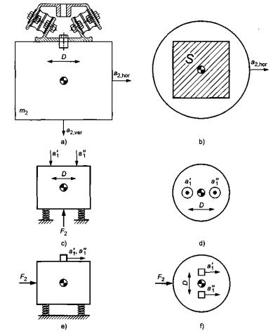 b) Зависимость частоты f3 от массы стального блока 1 - для блока в виде сплошного цилиндра; 2 - для блока в виде сплошного куба; r - длина стороны куба; d - диаметр цилиндра Примечание - Диаметр d блока цилиндрической формы должен быть равен высоте h. Рисунок 9 - Номограммы для стальных блоков кубической или цилиндрической формы, лист 1 Если такие блоки применяют в испытательной установке, то по формуле (1) вычисляют переходную динамическую жесткость в диапазоне частот f ≤ f3, где f3 - значение, определяемое по номограмме, изображенной на рисунке 9 а), для заданного размера стального блока. Примечание - На рисунке 9b) показано соотношение между частотой f3 и массой т2 блока кубической (цилиндрической) формы. Масса т2 (по возможности, минимальная) может быть выбрана из соображений получения требуемого значения нижней границы диапазона частот f2. В этом случае по номограмме, изображенной на рисунке 9b), для заданного значения т2 определяют f3, а потом для полученного значения f3 по номограмме, изображенной на рисунке 9а), определяют диаметр d или размер ребра r стального блока. 6.2.3 Определение эффективной массы экспериментальным путем Если по какой-либо причине невозможно использовать в качестве нагружающей массы стальной блок с размерами, формой или массой, соответствующими приведенным на номограммах рисунка 9, то используют блоки с другими формами и размерами. В этом случае значение f3 определяют экспериментально. Чтобы избежать угловых колебаний при возбуждении поступательной вибрации, нагружающая масса должна обладать симметрией, при которой ее основные оси инерции совпадают с осями декартовой системы координат с центром, находящимся в центре нагружающей массы, и направлениями, совпадающими с направлениями нормальной и поперечной вибрации. Для выполнения данного требования выбирают блоки, изготовленные из однородного материала, имеющие одну из следующих форм: сплошной цилиндр, пустотелый цилиндр, параллелепипед или их сочетание. Для нахождения значения f3 определяют эффективную массу т2,eff как функцию частоты. При этом в качестве значения f3 принимают минимальное значение частоты, при которой разность между т2,eff и т2 составляет более 12 % (1 дБ). Затем переходную динамическую жесткость испытуемого объекта вычисляют по формуле (1). Полученные значения будут достоверны только в диапазоне частот f ≤ f3, для которого справедливо неравенство Метод определения эффективной массы изображен на рисунке 10. На рисунках 10а) и 10b) показаны испытуемые объекты, соединенные с нагружающей массой через область контакта площадью S. В процессе испытаний измеряют ускорения в вертикальном (а2,vert) или горизонтальном (а2,hor) направлениях (в зависимости от направления возбуждения) на входной стороне упругого элемента. Рисунки 10с) и 10d) соответствуют возбуждению в вертикальном направлении. В отсутствии испытуемого объекта нагружающая масса поддерживается упругими пружинами. Собственная частота этой массово-упругой системы должна быть менее 10 Гц.