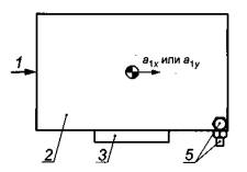 b) Возбуждение в поперечном направлении х или у 1 - вибровозбудитель; 2 - масса распределения возбуждения; 3 - входной фланец испытуемого объекта; 4 - нежелательная вибрация а'1х и а'1y; 5 - нежелательная вибрация a'1z и а'1y или a'1х Рисунок 11 - Точки измерений для контроля нежелательных составляющих вибрации При возбуждении в нормальном направлении входная вибрация а1z действует в направлении возбуждения в месте контакта массы распределения возбуждения и входного фланца испытуемого объекта. Нежелательные составляющие а'1х и а'1у следует измерять на краю массы распределения возбуждения в плоскости контакта массы распределения возбуждения и входного фланца испытуемого объекта [см. рисунок 11а)]. Упругие опоры многих типов имеют достаточную симметрию относительно оси нагрузки в нормальном направлении, что обеспечивает динамическую развязку колебаний в нормальном направлении от других составляющих вибрации (см. примечание к 5.1.6 и приложение А). Если пользователь настоящего стандарта определил, что объект испытаний симметричен, нет необходимости проверять выполнение неравенства (5) для возбуждения в нормальном направлении. В этом случае достаточно указать в протоколе испытаний класс симметрии, которому отвечает испытуемый объект [см. ГОСТ ИСО 10846-1 (приложение В)]. При возбуждении в поперечном направлении х или у входную вибрацию в направлении возбуждения а1х или а1у измеряют вдоль горизонтальной оси симметрии массы распределения возбуждения. Нежелательные составляющие вибрации а'1z и а'1у или а'1z и а'1у измеряют на краю массы распределения возбуждения [см. рисунок 11b)]. Если при наличии массивного входного фланца у испытуемого объекта массу распределения возбуждения не используют (см. примечание к 5.1.6), то должна быть определена схема расположения датчиков, аналогично показанной на рисунке 11, для контроля подавления нежелательных составляющих вибрации в соответствии с неравенством (5). 6.5 Акселерометры Акселерометры должны быть калиброваны в диапазоне частот измерений и иметь во всем диапазоне частот постоянный коэффициент преобразования в пределах 0,5 дБ. Калибровку проводят по ГОСТ 30652. Акселерометры не должны быть чувствительными к изменению условий окружающей среды, таких как температура, относительная влажность, магнитные поля. Коэффициент преобразования в поперечном направлении должен быть менее 5 %. Если вместо акселерометров используют датчики скорости или перемещения, они должны соответствовать тем же требованиям, что и акселерометры. 6.6 Датчики силы Датчики силы должны быть калиброваны в диапазоне частот измерений и иметь в этом диапазоне постоянный коэффициент преобразования в пределах допуска 0,5 дБ. Калибровку проводят методом нагрузки массой, установленным в ГОСТ ИСО 7626-1. Датчики силы не должны быть чувствительными к изменению условий окружающей среды, таких как температура, относительная влажность, магнитные поля. Коэффициент преобразования в поперечном направлении должен быть менее 5 %. 6.7 Суммирование сигналов При необходимости суммирования сигналов с датчиков силы или акселерометров, расширенная неопределенность выполнения данной операции должна быть не более 5 %. Одним из способов выполнения данного требования является применение датчиков одного типа с коэффициентами преобразования, отличающимися друг от