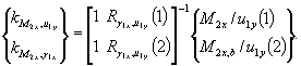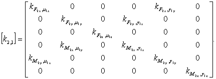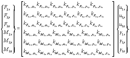 Матрица переходных жесткостей в формуле (А.1) связывает вектор затормаживающих сил и моментов сил на выходной стороне изолятора (левая часть уравнения) с вектором поступательных и угловых перемещений на входной стороне изолятора (правая часть уравнения).