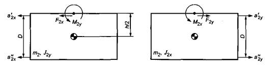 Согласно рисунку А.3 (слева) на нагружающую массу одновременно действуют затормаживающая сила F2x,b и затормаживающий момент М2y,b. Входная сторона объекта испытаний возбуждается с ускорением а1х.