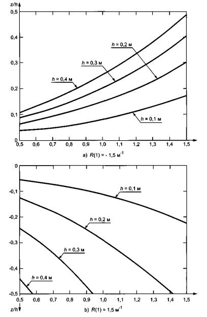 На рисунке А.6 приведены номограммы для выбора размеров цилиндрического блока и положения точки приложения силы в диапазоне - h < z < h при значениях R (1) = - 1,5 м-1 и R(2) = 1,5 м-1. Если точка приложения силы выходит за пределы размеров блока, то для удлинения плеча силы используют вспомогательный рычаг.