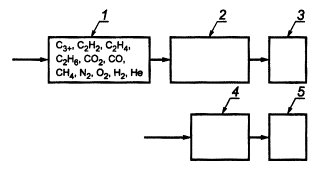 6.2.2 Относительные коэффициенты чувствительности Относительные коэффициенты чувствительности определяют в соответствии с ГОСТ 31371.2. 6.2.3 Градуировочные зависимости Градуировочные зависимости определяют в соответствии с ГОСТ 31371.2 не реже одного раза в год. 6.3 Выполнение измерений6.3.1 Компоненты: Не, Н2, O2, N2, CH4, СО, СO2, С2Н2, С2Н4 и С2Н6 Расположение колонок хроматографа 1 на разных стадиях анализа приведено на рисунках 1 - 3. Пробу вводят в предварительную PLOT колонку, в которой постоянные газы, СО и СН4 удерживаются слабо и, таким образом, отделяются от С2 и более тяжелых углеводородов. Переводят выходящие первыми компоненты, а именно Не, Н2, O2, N2, CH4 и СО в колонку с молекулярным ситом для разделения. Для определения постоянных газов и метана используют ДТП. Для определения СО, выходящего последним из колонки с молекулярным ситом, переключают колонку на линию с метанатором и ПИД. Не переведенные в колонку с молекулярным ситом СO2 и углеводороды дополнительно разделяют на предварительной PLOT колонке, затем их определяют с помощью метанатора и ПИД. После выхода этана фракцию С3+ отдувают на сброс. Примеры типичных хроматограмм приведены на рисунках 6 и 7. Разделение может быть достигнуто как на колонке с молекулярным ситом, так и на предварительной колонке в изотермическом режиме. Водород и гелий могут быть определены косвенным методом с использованием относительных коэффициентов чувствительности, хотя проблема с выбором правильных коэффициентов для ДТП хорошо известна. В общем случае, в качестве сравнительного компонента можно использовать азот (N2). Поскольку ДТП дает слабый отклик для оксида углерода при использовании аргона в качестве газа-носителя, рекомендуется для определения СО с молярной долей менее 0,2% применять ПИД. С этой целью СО через кран 2 направляют в метанатор и ПИД. 6.3.2 С3 и более тяжелые углеводороды Соединяют WCOT колонку, заполненную метилсиликоном, непосредственно с краном газовой пробы и ПИД (рисунок 5). Проводят разделение с использованием соответствующей температурной программы (например, от 35°С до 240°С со скоростью 8°С/мин). Применяют бутан в качестве сравнительного компонента для определения пентанов и более тяжелых углеводородов. Устанавливают скорость нагрева для температурной программы так, чтобы отделить СО от других пиков на хроматограмме, полученной с ПИД.