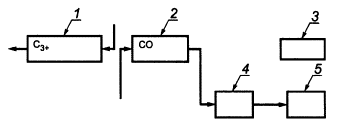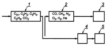 1 - предварительная PLOT колонка; 2 - PLOT колонка с молекулярным ситом; 3 - ДТП; 4 - метанатор, 5 - ПИД Рисунок 2 - Схема соединения колонок для определения СO2 и С2