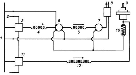 1 - газ-носитель; 2 - проба; 3 - кран 1 для пробы газа; 4 - предварительная PLOT колонка; 5 - кран 1; 6 - PLOT колонка с молекулярным ситом; 7 - кран 2; 8 - ДТП; 9 - ПИД; 10 - метанатор; 11 - кран 2 для пробы газа; 12 - WCOT колонка