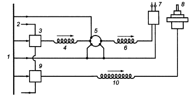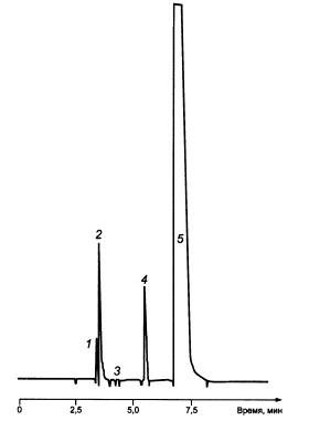 1 - газ-носитель; 2 - проба; 3 - кран 1 для пробы газа; 4 - предварительная PLOT колонка; 5 - кран 1; 6 - PLOT колонка с молекулярным ситом; 7 - ДТП; 8 - ПИД; 9 - кран 2 для пробы газа; 10 - WCOT колонка Если метанатор не установлен, СO2 и С2Н6 определяют с помощью сравнительной ячейки ДТП (рисунок 5), получая при этом обратные (отрицательные) пики этих компонентов. Все другие компоненты при этом отдуваются из предварительной колонки. Эффективность конверсии метанатора (никелевый катализатор) определяют посредством ввода контрольной пробы, содержащей известное количество метана, оксида углерода и диоксида углерода с объемной долей от 0,001% до 0,02%. При необходимости регулируют температуру катализатора, чтобы оптимизировать эффективность конверсии и симметричность пика. Кроме того, регулируют скорость подачи Н2, чтобы оптимизировать чувствительность. При оптимальных условиях работы метанатор обеспечивает эффективность конверсии, близкую к 100%. Рекомендуется определять стабильность метанатора. Даже малые количества H2S и других серосодержащих соединений, достигающих метанатора, вызывают немедленную деактивацию частиц катализатора. По этой причине H2S следует отсекать с помощью соответствующего переключения колонки. Отравление катализатора проявляется в виде хвостов у пиков СО и СO2. Рекомендуется периодическая проверка герметичности. Это можно осуществить с помощью ввода газа-носителя через кран-дозатор, при этом не должны появляться пики азота или кислорода. 5.2 Капиллярные колонки, состоящие из: 5.2.1 Предварительной капиллярной PLOT колонки из плавленого кварца для разделения воздуха, СO2, C2H2, С2Н4, C2H6 и C3H8. Чтобы обеспечить возможность переключения колонок, требуется достаточное разделение СН4 и CO2. Рекомендуется PoraPLOT U 1) колонка длиной 25 м, внутренним диаметром 0,53 мм, с толщиной фазы 20 мкм, поскольку она позволяет получить хорошее разделение этих компонентов. 1) Капиллярная колонка с пористым сорбентом Porapak U, нанесенным на внутреннюю поверхность. Она является примером коммерчески доступного продукта. Эта информация приводится для удобства потребителей настоящего стандарта и не представляет одобрение ИСО этого продукта. 5.2.2 Капиллярная PLOT колонка из плавленого кварца с молекулярным ситом для разделения Не, Н2, O2, N2, СН4 и СО. Эффективность разделения этой колонки проверяют, вводя контрольную пробу водорода с молярной долей 4% и Не с молярной долей 0,05%. Эффективность разделения должна быть достаточной для количественного определения обоих компонентов и должна удовлетворять требованию к разрешению пиков, приведенному в 6.2.1. Рекомендуется колонка с молекулярным ситом 5 Ǻ, длиной 25 м, внутренним диаметром 0,53 мм, с толщиной слоя 50 мкм. 5.2.3 Капиллярная WCOT колонка из плавленого кварца с неполярной фазой для разделения углеводородов С3 - С8. Эффективность разделения этой колонки достаточна, если разрешение пиков бензола и циклогексана удовлетворяет требованиям, приведенным в 6.2.1. Рекомендуется капиллярная колонка с метилсиликоном длиной 50 м, внутренним диаметром 0,32 мм, с толщиной слоя 5 мкм. Можно использовать другие разделяющие колонки, если они обладают сопоставимой эффективностью разделения. 6 Методика проведения анализа6.1 Условия проведения анализа6.1.1 Газовый хроматограф Подготовку газового хроматографа к работе (колонки, расходы газа-носителя и вспомога