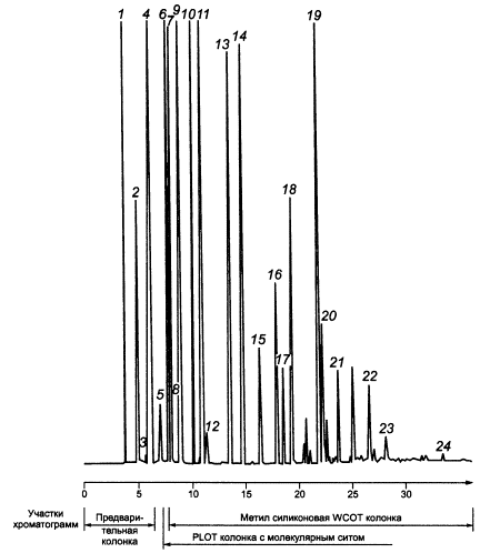 1 - диоксид углерода; 2 - этилен; 3 - ацетилен; 4 - этан; 5 - оксид углерода; 6 - метан; 7 - этан (этилен, ацетилен); 8 - пропилен; 9 - пропан; 10 - изобутан; 11 - н-бутан; 12 - неопентан; 13 - изопентан; 14 - н-пентан; 15 - 2,2-диметил-бутан; 16 - 2-метилметан; 2,3-диметилбутан и цикпопентан; 17 - 3-мвтаяпентан; 18 - н-гексан; 19 - бензол; 20 - циклогексан; 21 - н-гептан; 22 - толуол; 23 - н-октан; 24 - ксилолы Рисунок 7 - Хроматограмма анализа смеси СO2 и компонентов С1 - С8 на PoraPLOT U, WCOT колонках и колонке с молекулярным ситом 6.3.3 Детектирование 6.3.3.1 ДТП Для определения Не, Н2, O2, N2 и СН4 используют ДТП, СО можно определять при молярной доле > 0,2%, а СO2 - при молярной доле > 0,02%. 6.3.3.2 ПИД Для определения С2Н2, С2Н4 и С2Н6, выходящих из предварительной PoraPLOT U колонки, и всех углеводородов выше С3Н6, выходящих из WCOT капиллярной колонки с метилсиликоном, используют ПИД. При анализе имитаторов природного газа, а также для определения СO2 (после конверсии до СН4 в метанаторе), С2Н2 и С2Н4, выходящих из предварительной PoraPLOT U колонки и СО (после конверсии до СН4 в метанаторе), используют ПИД. Пики СН4, С2Н2, С2Н4 и С2Н6, которые только частично разделены на WCOT колонке с метилсиликоном, не могут быть использованы для количественного определения. 6.3.4 Сбор данных Начинают сбор данных по каналам обоих детекторов одновременно с временем первого ввода пробы. 7 ВычислениеВычисляют значения молярной доли компонентов в соответствии с ГОСТ 31371.1. 8 ПрецизионностьТипичные значения прецизионности, которые могут быть достигнуты этим методом, приведены в приложении А. 9 Протокол анализаПротокол анализа оформляют в соответствии с ГОСТ 31371.1, раздел 14. Приложение