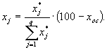 ненормализованные значения молярной доли компонентов и обозначаются В этом случае проводят нормализацию полученных при измерениях значений молярной доли компонентов в соответствии с ГОСТ 31371.2 (подраздел 5.6). Проведение нормализации допускается только в случаях, когда сумма молярных долей компонентов (измеренных и неанализируемых, принятых как условно-постоянные) находится в пределах от 98% до 102%. В случае если данное требование не соблюдается, следует провести расширенный анализ природного газа для уточнения значения молярной доли компонентов, которые не анализируются и рассматриваются как компоненты с условно постоянным значением молярной доли хос. Нормализованное значение молярной доли xj j-го компонента вычисляют по формуле