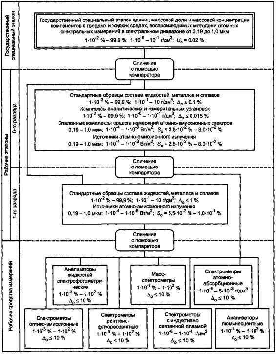 atomic spectral Дата введения - 2010-01-01 1 Область примененияНастоящий стандарт распространяется на государственную поверочную схему для средств измерений содержания компонентов в твердых и жидких средах методами атомных спектральных измерений (приложение А) и устанавливает порядок передачи размеров единиц: массовой доли - процент (%) и массовой концентрации - грамм на кубический дециметр (г/дм3) от государственного специального эталона единиц массовой доли и массовой концентрации компонентов в твердых и жидких средах, воспроизводимых методами атомных спектральных измерений в спектральном диапазоне от 0,19 до 1,0 мкм (далее - государственный специальный эталон), с помощью рабочих эталонов рабочим средствам измерений с указанием погрешностей и основных методов поверки. Порядок передачи размеров единиц средствам измерений (в диапазонах измерений более и менее указанных), созданным после утверждения настоящего стандарта, должен быть определен поверочными схемами, согласованными с ФГУП ВНИИОФИ. Допускается проводить поверку (калибровку) с помощью эталонов более высокой точности, чем предусмотрено настоящим стандартом. 2 Термины и определенияВ настоящем стандарте применены следующие термины с соответствующими определениями: 2.1 содержание компонента: Обобщенная величина, включающая в себя массовую долю компонента, массовую концентрацию компонента, характеризующие химический состав измеряемых твердых, жидких и (или) получаемых на их основе парообразных сред. 2.2 воспроизведение единицы физической величины; воспроизведение единицы: Совокупность операций по материализации единицы физической величины с помощью государственного первичного эталона. [РМГ 29 [1], статья 12.18] Примечание - Единицу содержания компонентов для конкретной измерительной задачи воспроизводят путем косвенных измерений данной величины в интервале значений посредством эталонов других величин, функционально связанных с измеряемой, и (или) с использованием фундаментальных физических констант. 2.3 рабочий эталон: Эталон, предназначенный для передачи размера единицы рабочим средствам измерений. [РМГ 29 [1], статья 12.6] Примечание - В качестве рабочих эталонов в настоящей государственной поверочной схеме используют стандартные образцы состава веществ и материалов, эталонные комплексы средств измерений и измерительных установок, эталонные источники излучения. 2.4 чистые вещества: Вещества с наивысшей достижимой в настоящий момент степенью чистоты. 2.5 источник излучения: Мера потока излучения с установленной спектральной интенсивностью, функционально связанной со значениями характеристик заданного содержания определенного компонента (компонентов). Примечание - В качестве источников излучения могут быть использованы эталонные спектральные лампы с тлеющим разрядом в полом катоде, выполненном на основе эталонных материалов и веществ, соответствующих по составу (содержанию компонентов) стандартным образцам. 3 Государственный специальный эталон3.1 В состав государственного специального эталона входят: - комплекс атомно-абсорбционых спектрометров; - комплекс атомно-флуоресцентной спектрометрии; - интерферометрический и спектрорадиометрический комплексы с системой источников атомно-эмиссионого излучения; - комплекс атомно-эмиссионной спектрометрии тлеющего