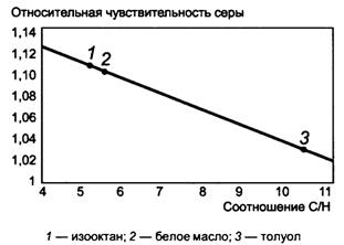 Рисунок 1 - Изменение относительной чувствительности серы 14.2.2 Для Случая III, основанного на анализе трех NIST-стандартных эталонных образцов (SRMS), отсутствовало заметное отклонение (смещение) между сертифицированными значениями и результатами, полученными в настоящем межлабораторном исследовании, хотя все три образца имели значения меньше PLOQ - значений, определенных для каждого типа образца. Анализированными SRM-бензинами были SRM 2298 (4,7 мкг/г S) и SRM 2299 (13,6 мкг/г S). Образец SRW 2723а (10 мкг/г S) анализировали вместе с образцами дизельного топлива. Приложение