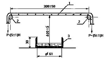 в пределах от 800 до 9.8 Метод проверки прочности поясного ремня после воздействия нагретого металлического стержняОтбор образцов Испытание проводят на трех образцах поясного ремня. Испытательное оборудование: а) термопечь, позволяющая поддерживать температуру (450 ± 10)°С в течение не менее 20 минут; б) стержень из стали марки Ст3 по ГОСТ 380 в соответствии с рисунком А.1 (приложение А) размером не менее (10´10´200) мм; в) секундомер с погрешностью не более 1,8 с за 60 минут; г) установка для испытаний на растяжение - должна обеспечивать измерение усилия с относительной погрешностью не более 1 %, минимальное расстояние между зажимами д) линейка металлическая с ценой деления Подготовка к испытанию Стальной стержень прогревают при температуре (450 ± 10)°С в течение не менее 20 минут. Проведение испытания Образец раскладывают по всей длине на горизонтальной поверхности. Не позднее чем через 5 с после прогрева накладывают стержень посередине образца в поперечном направлении. Не позднее чем через 30 с стержень убирают с образца. Процедуру повторяют для остальных образцов. Далее проводят поочередное нагружение трех образцов до их разрушения. В случае, если разрыв происходит на расстоянии менее Оценка результатов Поясной ремень считается выдержавшим испытание, если минимальное значение разрывного усилия, полученное на каждом из трех образцов, составило не менее 7,5 кН. 9.9 Метод проверки устойчивости материала поясного ремня к воздействию открытого пламениОтбор образцов Испытание проводят на трех образцах поясного ремня. Испытательное оборудование: а) линейка металлическая с ценой деления б) секундомер с погрешностью не более 1,8 с за 60 минут; в) этиловый спирт по ГОСТ 18300 или ГОСТ 17299; г) цилиндрическая емкость для горючего диаметром д) установка для испытаний на растяжение - должна обеспечивать измерение усилия с относительной погрешностью не более 1 %, минимальное расстояние между зажимами Проведение испытания Образец поясного ремня устанавливают на приспособление для проведения огневых испытаний в соответствии с рисунком 1. Образец помещают между двумя опорами, расположенными на расстоянии (300 ± 50) мм друг от друга (см. рисунок 1). К каждому краю образца прикладывают груз Р массой (510 ± 10) г. Образец располагается на расстоянии (100 ± 5) мм над емкостью, которая наполняется этиловым спиртом в количестве (10 ± 1) мл при температуре (20 ± 5)°С. Этиловый спирт поджигают, и в течение не менее 15 с образец выдерживают под действием открытого пламени. Данную процедуру повторяют с остальными образцами. Далее проводят поочередное нагружение трех образцов до разрушения. Оценка результатов Поясной ремень считается выдержавшим испытание, если значение разрывного усилия, полученное на каждом из трех образцов, составило не менее 7,5 кН.