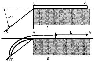 Рисунок 4 - Схема измерения угла сгиба Это испытание выполняют в положениях, представленных на рисунке 3, а - г. Оценка результатов Поясной ремень считается выдержавшим испытание, если величина угла для каждого из образцов находится в пределах от 30° до 60°. 9.11 Метод проверки прочности фала после воздействия температуры окружающей среды (600 ± 10)°СОтбор образцов Испытание проводят на трех образцах фала, имеющих хотя бы один заделанный заводским способом конец. Примечание - Длина образца определяется в зависимости от вида установки или стенда, позволяющих провести данное испытание. Испытательное оборудование: а) термопечь, позволяющая поддерживать температуру (600 ± 10)°С в течение не менее 1 минуты; б) установка для испытаний на растяжение - должна обеспечивать измерение усилия с относительной погрешностью не более 1 %, расстояние между зажимами не менее в) линейка металлическая с ценой деления г) секундомер с погрешностью не более 1,8 с за 60 минут. Подготовка образцов Образцы фалов, скрученные в спираль, перед испытанием помещают в термопечь с температурой (600 ± 10)°С таким образом, чтобы они не касались стенок. Образцы выдерживают в термопечи в течение не менее 10 с. Не позднее чем через 30 минут после выдержки в термопечи образцы должны быть подвергнуты нагружению до разрушения. Проведение испытания Производится поочередное нагружение образцов до их разрушения. В случае, если разрыв происходит на расстоянии менее Оценка результатов Фал считается выдержавшим испытание, если минимальное значение разрывного усилия, полученное на каждом из трех образцов, составило не менее 7,5 кН. 9.12 Метод проверки прочности фала после воздействия нагретого металлического стержняМетод испытания в соответствии с 9.8. Перед испытанием на прочность образцы подготавливают следующим образом: а) раскладывают образец по всей длине на горизонтальной поверхности; б) стержень из стали марки Ст3 по ГОСТ 380 в соответствии с рисунком А.1 (приложение А) размером не менее (10´10´200) мм прогревают в термопечи при температуре (450 ± 10)°С в течение не менее 20 минут; в) не позднее чем через 5 с после прогрева накладывают стержень посередине образца перпендикулярно его продольному направлению; г) не менее чем через 30 с стержень убирают с образца; д) повторяют данную процедуру для остальных образцов. Далее проводят поочередное нагружение трех образцов до разрушения. Оценка результатов Фал считается выдержавшим испытание, если минимальное значение разрывного усилия, полученное на каждом их трех образцов, составило не менее 7,5 кН. 9.13. Метод проверки прочности фала после воздействия открытого пламениМетод испытания в соответствии с 9.9. Оценка результатов Фал считается выдержавшим испытание, если значение разрывного усилия, полученное на каждом из трех образцов, составило не менее 7,5 кН. 9.14 Метод проверки жесткости фалаОтбор образцов Проверка показателя жесткости фала проводится на шнуре фала без заделанных концов. Испытание проводится на трех образцах длиной (0,50 ± 0,01) м. Испытательное оборудование Линейка металлическая с ценой деления Проведение испытания Образец укладывают на горизонтальной и плоской поверхности в соответствии со схемой, изображенной на рисунке 5, а, таким образом, чтобы один конец образца находился в точке А, а другой в точке В. Груз Р массой (0,023 ± 0,001) кг крепят 