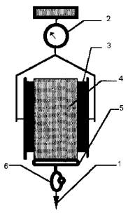 1 - место приложения нагрузки; 2 - датчик силы (динамометр); 3 - ролик; 4 - пояс; 5 - карабинодержатель; 6 - карабин пожарный Рисунок 6 - Схема нагружения пояса Оценка результатов Пояс считается выдержавшим испытание, если ни один конструктивный элемент пояса не разрушился за время проведения испытания (допускается деформация конструктивных элементов, не приводящая к их разрушению). 9.16 Метод проверки несущей способности пояса после воздействия температуры окружающей среды минус (40 ± 1)°СМетод испытания в соответствии с 9.15 со следующими изменениями. Образцы перед испытанием выдерживают в холодильной камере при температуре минус (40 ± 1)°С в течение не менее 6 часов. При этом образцы не должны касаться стенок камеры. Оценка результатов Пояс считается выдержавшим испытание, если ни один конструктивный элемент пояса не разрушился за время проведения испытания (допускается деформация конструктивных элементов, не приводящая к их разрушению). 9.17 Метод проверки несущей способности пояса после воздействия температуры окружающей среды (200 ± 5)°СМетод испытания в соответствии с 9.15 со следующими изменениями. Термокамера с принудительной циркуляцией воздуха, позволяющая поддерживать температуру (200 ± 5)°С в течение не менее 3 минут. Внутренние размеры термокамеры должны позволять разместить образец ленты таким образом, чтобы он не касался стенок. Подготовка к испытанию Термокамера предварительно должна быть нагрета до температуры (200 ± 5)°С. Пояс в сборе (при наличии страховочной системы подсумок должен быть открыт, амортизатор с фалом должны быть вынуты из подсумка) помещают в термокамеру так, чтобы он не касался стенок камеры, и выдерживают в ней в течение не менее 3 минут. После выдержки в термокамере образец выдерживают в нормальных климатических условиях по ГОСТ 15150 в течение не менее 24 часов. Оценка результатов Пояс считается выдержавшим испытание, если ни один его конструктивный элемент не разрушился за время проведения испытания (допускается деформация конструктивных элементов, не приводящая к их разрушению). 9.18 Метод проверки несущей способности пояса после воздействия водыМетод испытания в соответствии с 9.15 со следующими изменениями. Образцы перед испытанием помещают в емкость, которая заполняется водой до полного погружения образцов. Образцы выдерживают в воде в течение не менее 1 часа. По истечении указанного времени образцы извлекают из воды и не позднее чем через 30 минут проводят испытания нагружением до 10 кН. Оценка результатов Пояс считается выдержавшим испытание, если ни один его конструктивный элемент не разрушился за время проведения испытания (допускается деформация конструктивных элементов, не приводящая к их разрушению). 9.19 Метод проверки несущей способности пояса после воздействия 5 %-ным водным раствором натрия хлористогоМетод испытания в соответствии с 9.15 со следующими изменениями. Образцы перед испытанием помещают в емкость, которая заполняется 5 %-ным водным раствором натрия хлористого до полного погружения образцов. Образцы выдерживают в растворе в течение не менее 1 часа. По истечении указанного времени образцы извлекают из раствора и не позднее чем через 30 минут проводят испытания нагружением до не менее 10 кН. Оценка результатов Пояс считается выдержавшим испытание, если ни один его конструктивный элем